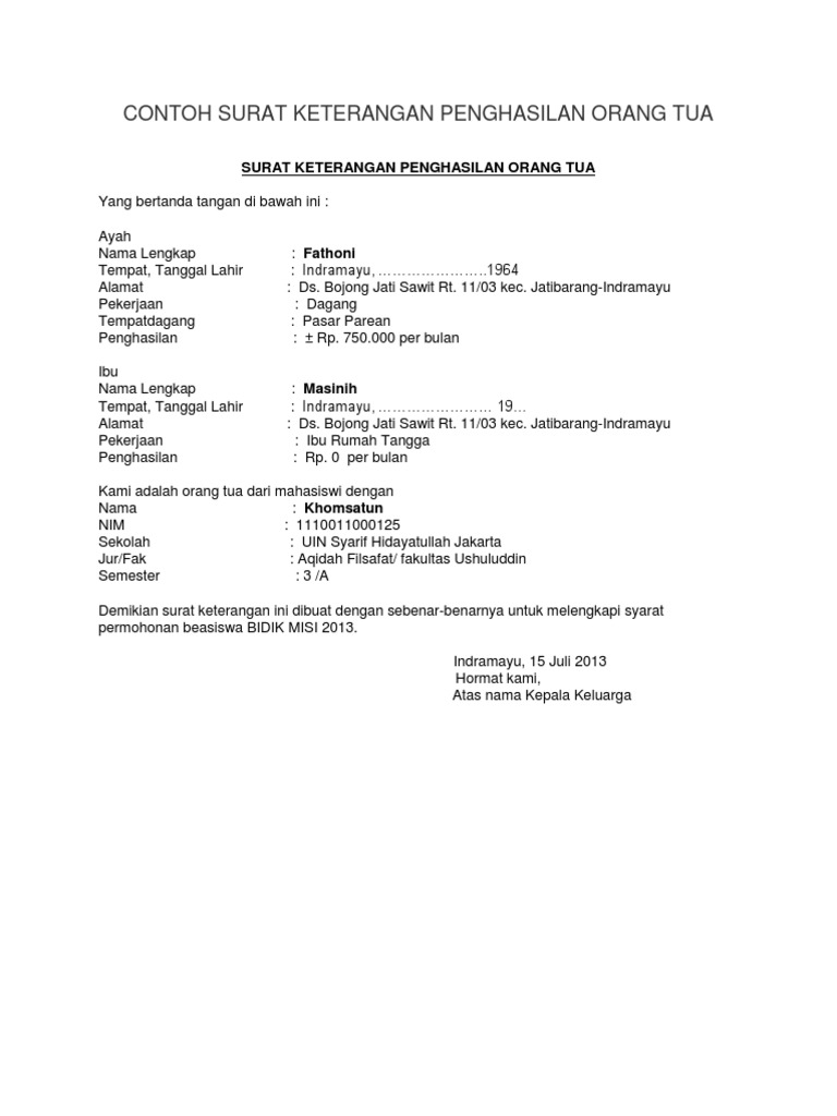 Cara Membuat Surat Keterangan Penghasilan Orang Tua Untuk Beasiswa Riskyobama from psikologi.unair.ac.id Contoh surat keterangan penghasilan untuk pengajuan kartu kredit / kpr. Demikian surat keterangan penghasilan ini kami buat untuk dapat dipergunakan sebagaimana mestinya. Ada beberapa keperluan yang biasanya mewajibkan adanya surat ini. Demikianlah informasi mengenai contoh surat keterangan penghasilan orang tua yang bisa kami sampaikan kepada anda semuanya. Contoh surat penghasilan orang tua kelurahan bantul, yogyakarta. Keterangan penghasilan orang tua ini biasanya diberikan oleh pejabat kampung untuk kepentingan tertentu salah satunya sebagai syarat seleksi pengajuan beasiswa bagi pelajar. Berikut contoh surat keterangan penghasilan yang dikeluarkan oleh kelurahan atau desa, namun alangkah baiknya anda langsung menuju ke kelurahan atau balai desa jangan lupa juga untuk membaca lagi contoh surat keterangan kerja yang telah kami update pada kesempatan sebelumnya. Contoh surat keterangan penghasilan untuk kredit leasing.