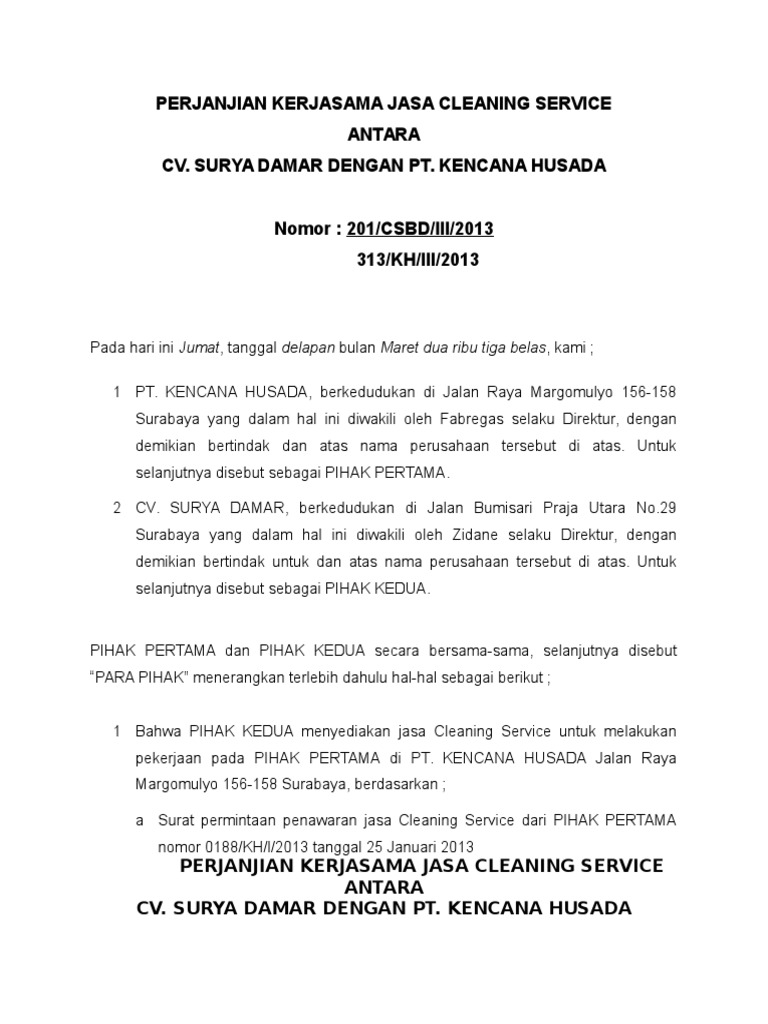 Bagi kalian yang belum tahu atau. Surat penawaran jasa dibuat dan dikeluarkan oleh suatu perusahaan yang akan menawarkan suatu jasa atau layanan kepada pihak lain. Contoh surat penawaran jasa kebersihan/cleaning service. Surat diatas merupakan contoh surat penawaran jasa yang dikirimkan oleh pt. Teknik enjiner perbaikan, pemasangan dan. Sehubungan dengan hal tersebut, maka izinkan kami untuk menawarkan jasa cleaning service yang kami miliki. Tidak hanya terbatas pada produsen dan konsumen saja, bahkan sesama pelaku usaha (produsen) pun juga saling memberikan penawaran. Contoh surat penawaran jasa cleaning service. Penawaran harga jasa cleaning service kepada yth. Last updated 6 desember 2020. 031/hds/i/2017 perihal :penawaran jasa operator cleaning servis paroh waktu dan general cleaning lampiran documents similar to penawaran jasa cleaning servis da ob. Di sini kami siap untuk. Dengan hormat, berdasarkan surat informasi yang telah saudara ajukan, kami berkenan untuk memesan jasa yang saudara tawarkan untuk membersihkan ruangan kantor kami.